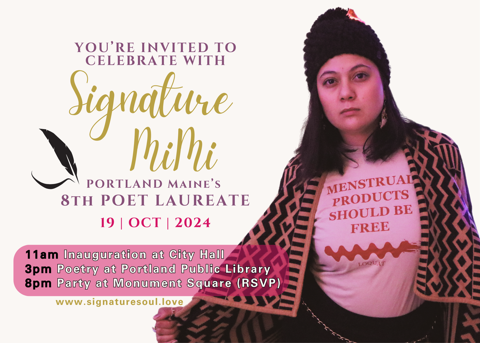 PORTLAND POET LAUREATE INAUGURATION 2024 By Signature MiMiMiMi's JOURNAL, UPCOMING YOU’RE INVITED TO CELEBRATE WITH SIGNATURE MiMiPORTLAND MAINE’S 8th POET LAUREATE19 | OCT | 2024 11am Inauguration at City Hall3pm Poetry at Portland Public Library8pm Party at Monument Square RSVP HERE Portland Poet Laureate Inauguration | Portland Public Library (portlandlibrary.com)