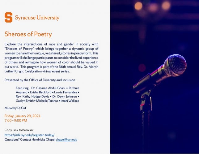 SHEROES OF POETRY By SIGNATURE MiMiFEATURES Signature MiMi shared poetry at her Alma Mater ~ Syracuse University, in celebration of the life and legacy of Dr. Martin Luther King Jr.